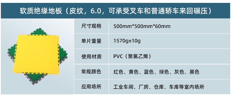 軟質(zhì)絕緣地板采用純新軟性PVC(聚氯乙烯)生產(chǎn)而成,具有防滑、防油、靜音、抗沖擊、高承載等特點,可以快捷安裝在任何現(xiàn)有的基板,包括木材,混凝土,環(huán)氧樹脂,瓷磚,水磨石等,廣泛應(yīng)用于車間廠房地面、倉庫地面、車庫地面、健身房、展廳等場所。