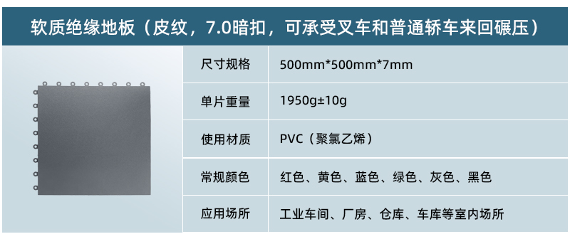 5、高承載,更防滑: 軟質絕緣地板為實心結構,只要地面承重沒有問題,其承載能力能夠達到每平米10噸以上。地板表面在生產過程中帶有凸起的紋路,讓車間地面更為防滑。